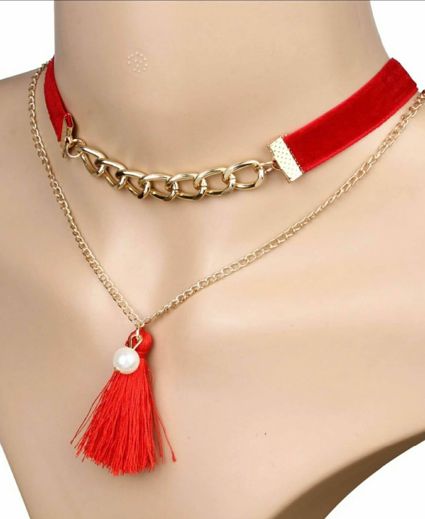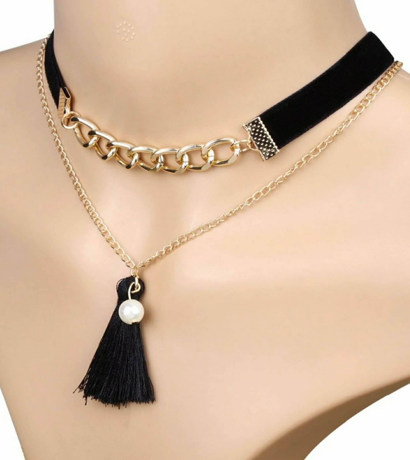 Bijoux plain velvet ribbon tassel statement necklace, multilayer pendant.